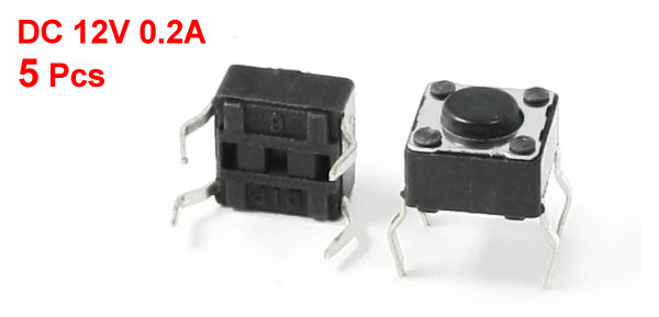 Details5PCS Home Appliance Spare Part Momentary Tact Switch 4.3x6.2x6.2mm DC12V 0.2A  Product Name Tact Switch Contact Type Momentary Contact Working Current & Voltage DC 12V 0.2A Dimension 4.3 x 6.2 x 6.2mm / 0.315" x 0.24" x 0.24" (H*L*W) Button Dia 3.5mm/0.14" Pin Number 4 Material Plastic, Metal, Electric Parts Color Silver Tone, Black Net Weight 1g Package Content 5 PCS x Tact Switch