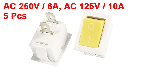 Product Name Rocker Switch Material Plastic Model KCD1 Contact Pin 2 Pin Switch Type SPST Voltage / Current AC 250V / 6A, AC 125V / 10A Size 20 x 15 x 17mm / 0.8" x 0.6" x 0.7"(L*W*H) Color Yellow, White Weight 16g Package Content 5 x Rocker Switches - Reviews