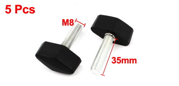 Product Name T Clamping Screw Knob Type Screw On Head Size 32 x 17 x 14mm/1.3" x 0.67" x 0.6"(L*W*T) Thread Size 8 x 35mm/0.3" x 1.4"(D*L) Material Metal, Plastic Color Black, Silver Tone Weight 108g Package Content 5 x T Clamping Screw Knob - Reviews