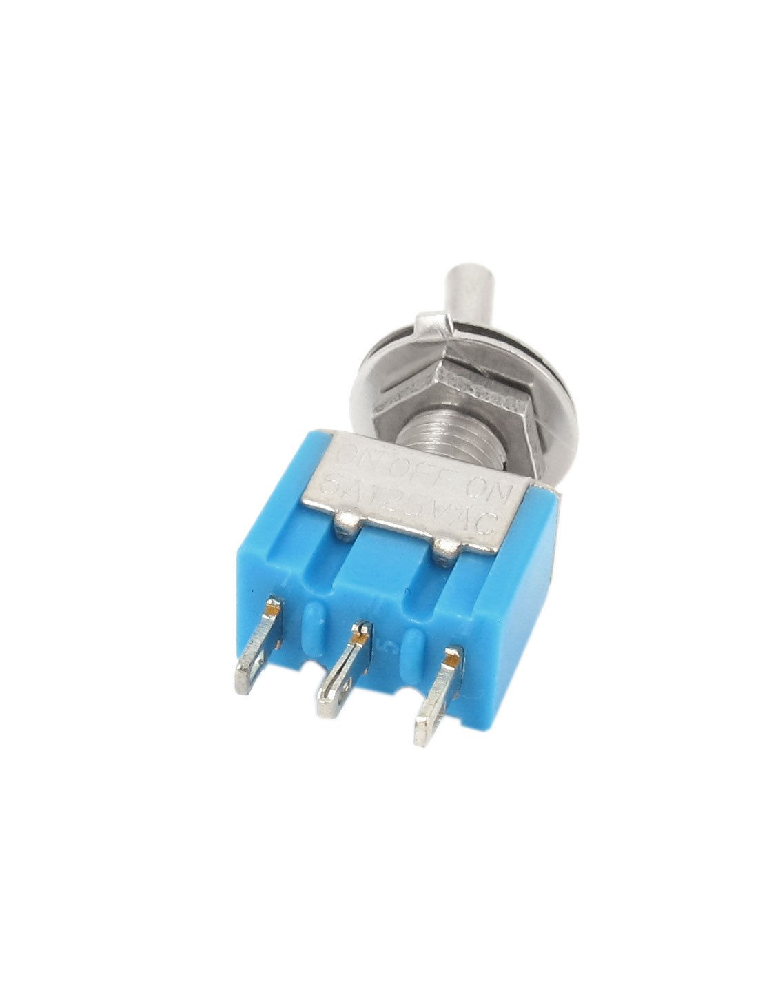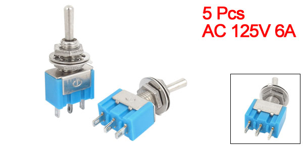 Product Name Toggle Switch Material Metal, Plastic Type SPDT Rating AC 125V 6A Pins Number 3 Position 3(ON/OFF/ON) Body Size 13 x 8 x 10mm/0.5" x0.31" x 0.4" (L*W*H) Thead Dia(Approx) 0.57cm / 0.22" Total Height 3.3cm / 1.3" Color Blue, Silver Tone Net Weight 26g Package Content 5 x Toggle Switch - Reviews