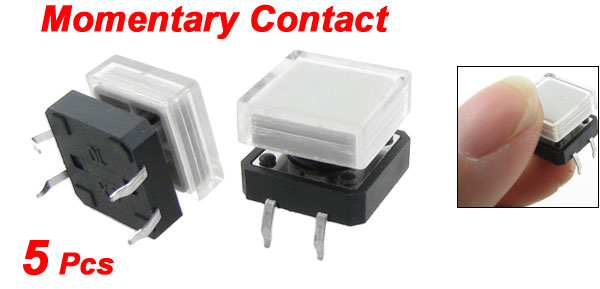 Product Name Tact Switch Contact Type Momentary Contact Dimension 12 x 12 x 14mm / 0.47" x 0.47" x 0.55" (L*W*H) Button Size 12 x 12 x 6mm/ 0.47" x 0.47" x 0.24" (L*W*H) Pin Pitch 6mm / 0.24" Pin Length 5mm / 0.2" Material Plastic, Metal, Electric Parts Color Black, Silver Tone, Grey, Clear Net Weight 7g Package Content 5 Pcs x Tact Switches - Reviews