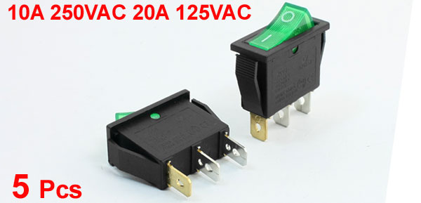 5Pcs Panel Mount Green Lamp 10A 250VAC 20A 125VAC 3Pin SPST Rocker Switches