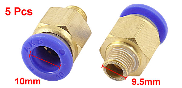 Product Name Quick Fittings Design Male Thread Straight Connect Type Male Thread 9.5mm/0.37"(1/8PT) Fit Tube Outside Dia 10mm/0.39"(2/5") Material Plastic, Brass Dimension (Approx) 19 x 19 x 27mm/ 0.94" x 0.94" x 1.1" (L*W*H) Color Brass Tone, Blue Weight 44g Package Content 5 x Quick Fittings - Reviews