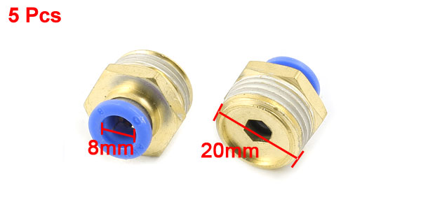Product Name Quick Fittings Design Male Thread Straight Connect Type Male Thread 20mm/0.79"(1/2PT) Fit Tube Outside Dia 8mm/0.31"(5/16") Material Plastic, Brass Dimension (Approx) 24 x 24 x 21mm/ 0.94" x 0.94" x 0.83" (L*W*H) Color Brass Tone,Blue Weight 127g Package Content 5 x Quick Fittings - Reviews