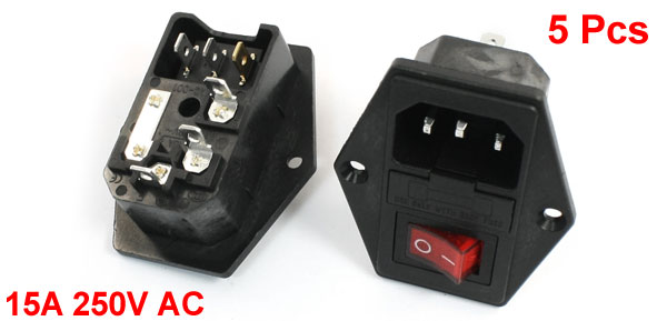 Product Name Power Socket Plug Type IEC320 C14 Voltage & Current 15A 250V AC Light Color Red Rocker Switch Type 3Pin SPST Fit Fuse Size 5 x 20mm/ 0.2" x 0.79" (L*W) Total Socket Size 5.8 x 4.8 x 3.3cm/2.3" x 1.9" x 1.3"(L*W*T) Mount Size 4.8 x 2.7cm/1.9" x 1"(L*W) Material (External) Plastic, Metal Main Color Silver Tone, Black Weight 133g Package Content 5 x Power Socket w Fuse Holder w Rocker Switch