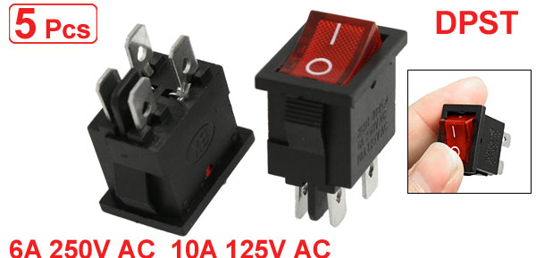Product Name Rocker Switch Poles DPST Terminals 4 Pin (On - Off) Rating Voltage 6A 250V AC 10A 125V AC Total Size(Each One) 21 x 15 x 29mm / 0.83" x 0.59" x 1.14"(L * W * T) Fixing Hole Size 18 x 12.5 x 23mm / 0.71" x 0.5" x 0.9"(L * W * H) Color Black,Red Material Plastic & Metal Total Weight 22g Package Content 5 x Rocker Switch - Reviews