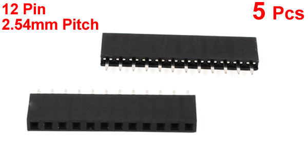 Product Name Female Pin Header Socket Number of Pins 12 Number of Rows 1 Pin Pitch 2.54mm/0.1'' Pin Length 3mm / 0.12" Size 31 x 2 x 12mm/1.2" x 0.08'' x 0.5"'(L*W*H) Material Plastic, Metal Main Color Black, Gold Tone Net Weight 6g Package Content 5 x Female Pin Header Socket - Reviews