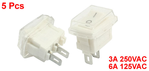 Details5Pcs SPST Waterproof 2Pin Soldered Snap in Rocker Switch 3A 250VAC 6A 125VAC  Product Name Rocker Switch Poles SPST Terminals 2 Pins Position On-Off Rated Voltage 3A 250VAC, 6A 125VAC Overall Size 20 x 17 x 11mm / 0.8" x 0.67" x 0.43" (L*W*T) Mounting Size 14 x 8mm / 0.55" x 0.31" (L*W) Color White, Clear Material Plastic, Metal Total Weight 9g Package Content 5 Pcs x Rocker Switches