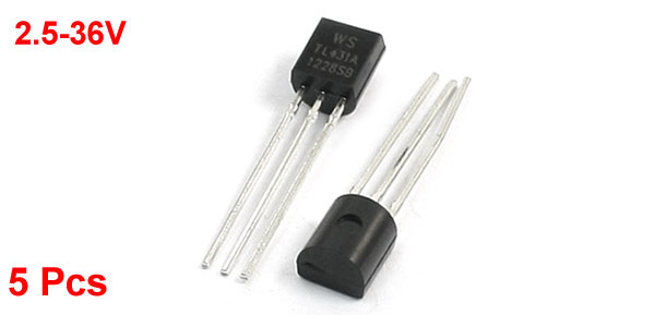 Product Name Adjustable Precision Shunt Regulator Model TL431A Packaging Type TO-92 Output Voltage 2.5-36V Sink Current 1mA-100mA Output Impedance 0.2 Ohm Working Temperature -40-125°C Pin Number 3Pins Pin Length 14mm/ 0.55" Overall Size(Each) 18 x 4 x 3mm/ 0.71" x 0.16" x 0.12" (L*W*T) Material Metal, Plastic Color Black, Silver Tone Weight 2g Package Content 5Pcs x Adjustable Precision Shunt Regulator - Reviews