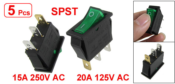 5pcs x Green Light ON-OFF I/O SPST Boat Rocker Switch 3 Pin 15A/250V 20A/125V AC