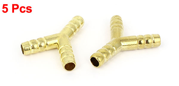 Details5PCS Y Shape 3 Ways 10mm Dia Hose Barb Fitting Adapter Connector Gold Tone  Product Name Y Hose Barb Design Y Shape , 3 Ways Hose Outer Diameter 10mm / 3/8" Total Length 52mm / 2" Material Brass Color Gold Tone Net Weight 98g Package Content 5 x Y Hose Barbs