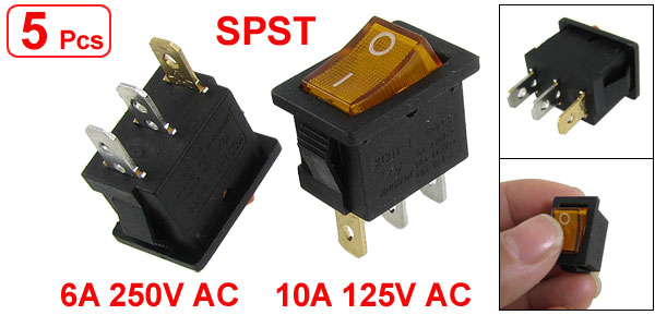 5pcs Yellow Neon Light ON-OFF I/O SPST Rocker Switch 3 Pin 6A/250V 10A/125V AC