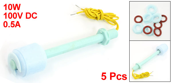Product Name Floating Switch Model No. ZP10010 Max Contact Rating 10W Max Switching Voltage 100V DC Max Switching Current 0.5A Max Breakdown Voltage 220V DC Max Carry Current 1A Max Contact Resistance 100mΩ Temperature Rating -10 / +85 °C Float Ball Material P.P Float Body Material P.P Thread Dia(Approx) 10mm / 0.39" Thread Length 15mm / 0.59" Switch Length(Thread Excluded) 100mm / 3.9" Cable Length 36cm / 14.2" Color Light Blue Net Weight 94g Package Content 5 x Floating Switch - Reviews