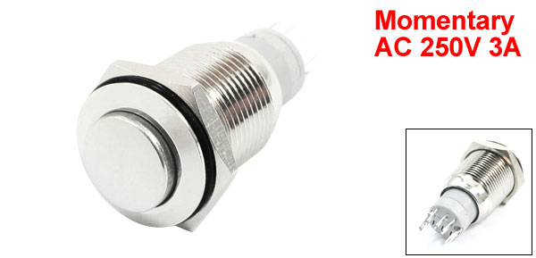 Item Name Push Button Switch Action Type Momentary Type Head Shape Round Flat Head Contact SPDT(1NO 1NC 1Com ) Switch Rating 250VAC 3A Pin Number 5 Thread Diameter 16mm/0.63" Total Size 38 x 19mm/1.5" x 0.75"(L*Max.W) Material Stainless Steel, Plastic, Electric Parts Housing Color Silver Tone Weight 17g Package Content 1 x Push Button Switch - Reviews