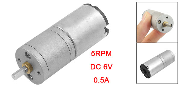 Product Name DC Geared Motor Rated Voltage DC 6V Rated Current 0.5A Output Speed 5RPM Output Shaft Diameter 4mm / 0.157" Gearbox Part Diameter 25mm / 0.98" Total Length(Approx.) 72mm / 2.8" Material Metal, Electronic Parts Color As Picture Shown Weight 94g Package Content 1 x DC Geared Motor - Reviews