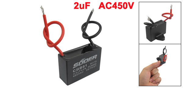 Terminal Wire Ambient Temperature 25/70/21 Rated Capacitance 2uF Tolerance +/-5% Rated Frequency 50/60Hz Rated Voltage 450V AC Size 3.6 x 2.4 x 1.3cm / 1.4" x 0.9" x 0.55“(L*W*T) Wire Length 10cm/ 3.9" Install Bore Diameter 0.5cm/ 0.2‘ Main Color Black Weight 16g Package Content 1 x Motor Run Capacitor - Reviews