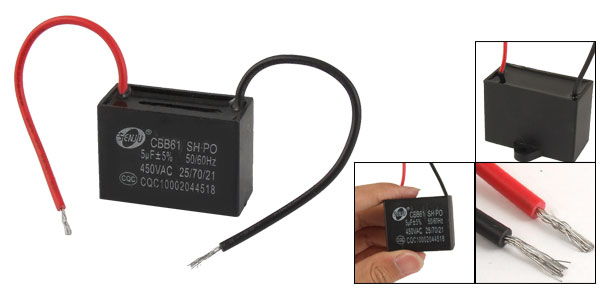 Product Name Motor Capacitor Housing Material Plastic Dielectric Material Metalized Polypropylene Model CBB61 Capacitance 5uF Tolerance ±5% Rated Voltage 450VAC Frequency 50/60Hz Body Size 4 x 3.2 x 2.3cm / 1.57" x 1.26" x 0.9" (L * W * T) Wire Length(Approx.) 10cm / 3.9" Color As Picture Shown Weight 35g Package Content 1 x Motor Capacitor - Reviews