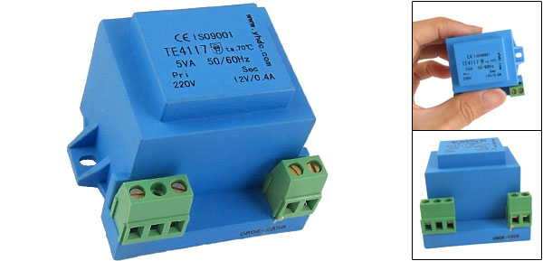 Product Name Encapsulated Transformer Model TE4117 Power 5VA, 50/60 Hz Primary 220V Secondary 12V, 0.4A Total Size(Approx.) 5.7 x 4.6 x 4.2cm/2.2'' x 1.8'' x 1.7'' (L*W*H) Color Blue Weight 225g Package Content 1 x Encapsulated Transformer - Reviews
