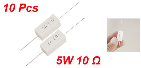 Product Name Cement Resistor Body Material Ceramic, Cement Power 5W Resistance 10Ω Tolerance ±5% (J) Body Size (Approx.) 22 x 10 x 10mm/0.86" x 0.39" x 0.39" (L * W * H) Lead Diameter (Approx.) 0.8mm/0.031" Color White Weight 49g Package Content 10 x Cement Resistors - Reviews