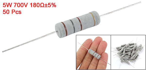 Product Name Metal Oxide Film Resistors Power Rating 5W Resistance Value 180 Ω Resistance Tolerance ± 5% Withstang Voltage 700V Lead Size (Each End) 30 x 0.5mm / 1.18" x 0.019" (L*D) Body Size (Approx.) 24 x 7.3mm / 0.94" x 0.287" (L*D) Color As Picture Shown Weight 185g Package Content 50(±2%) x Metal Oxide Film Resistors - Reviews