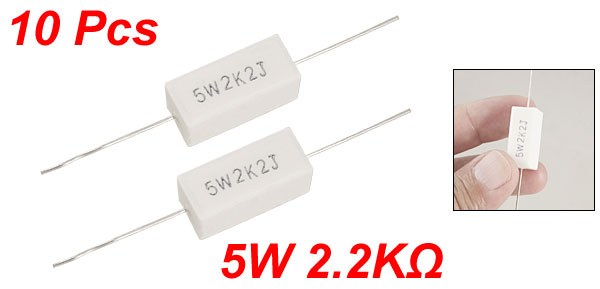 Details5W 2.2K 2K2 Ohm 5% Ceramic Cement Resistor 5 Watt 10pcs  Product Name Cement Resistor Body Material Ceramic, Cement Power 5W Resistance 2.2KΩ Tolerance ±5% (J) Body Size (Approx.) 22 x 9 x 9mm/0.86" x 0.35" x 0.35" (L * W * H) Lead Diameter (Approx.) 0.7mm/0.027" Color White Weight 48g Package Content 10 x Cement Resistors