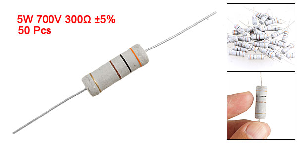 Product Name Metal Oxide Film Resistors Quantity 50 Pcs ± 2% Power Rating 5 W Resistance Value 300Ω Tolerance ± 5% Withstang Voltage 700V Lead Size (Each End) 29.1 x 0.7mm / 0.145" x 0.027" (L * D) Body Size (Approx.) 23.8 x 7.5mm / 0.937" x 0.295" (L * D) Color As Picture Show Weight 187g Package Content 50 x Metal Oxide Film Resistors - Reviews
