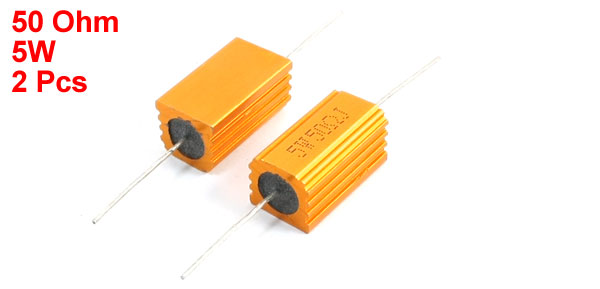 Product Name Aluminum Resistor Resistance Value 50 Ohm Power Rating 5W Resistance Tolerance ± 5% (J) Lead Dia 0.8mm/0.0315" Total Length 63mm/2.5" Body Size 19 x 11 x 10mm/0.75" x 0.43" x 0.39"(L*W*T) External Material Aluminum Color Gold Tone Net Weight 10g Package Content 2 x Aluminum Resistor  - Reviews