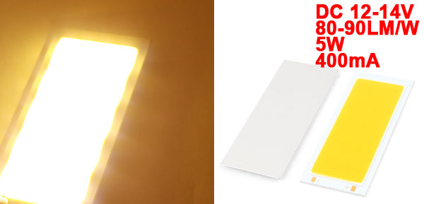 Product Name COB LED Lamp Beads Luminous Flux 80-90LM/W Color Temperature 2800-3000K Power 5W Current 400mA Light Color White Material Aluminum Color Silver Tone, Orange Size 72 x 30mm/ 2.9" x 1.2" (L*W) Luminous Surface 62 x 25mm/ 2.4" x 1"(L*W) Weight 93g Package Content 10 x COB LED Lamp Beads - Reviews