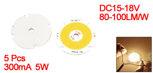 Product Name COB LED Lamp Beads Rated Voltage DC15-18V Luminous Flux 80-100LM/W Color Temperature 2800-3000K Power 5W Current 300mA Light Color Warm White Material Aluminum Color Silver Tone, Orange Diameter 36mm/1.4" Luminous Surface 28mm/ 1.1"(Diameter) Weight 29g Package Content 5 x COB LED Lamp Beads - Reviews