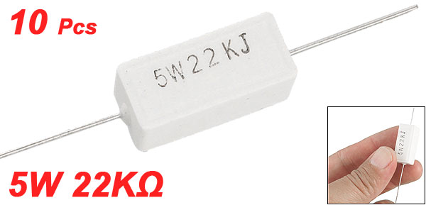 Product Name Cement Resistor Body Material Ceramic, Cement Power 5W Resistance 22KΩ Tolerance ±5% (J) Body Size (Approx.) 22 x 10 x 9mm/0.86" x 0.39" x 0.35" (L * W * H) Lead Diameter (Approx.) 0.8mm/0.031" Color White Weight 51g Package Content 10 x Cement Resistors - Reviews