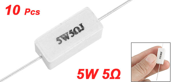 Product Name Cement Resistor Body Material Ceramic, Cement Power 5W Resistance 5Ω Tolerance ±5% (J) Body Size (Approx.) 22 x 9 x 9mm/0.86" x 0.35" x 0.35" (L * W * H) Lead Diameter (Approx.) 0.8mm/0.031" Color White Weight 42g Package Content 10 x Cement Resistors - Reviews
