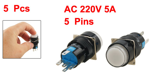 5x AC 220V White Light Momentary SPDT AC 250V 5A Round Push Button Switch