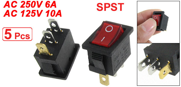 5x AC 6A/250V 10A/125V Red Light ON/OFF I/O SPST Snap In Boat Rocker Switch 3Pin