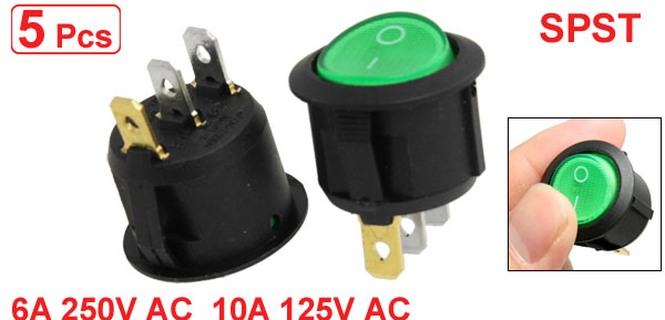 5x Green Light 3 Pin ON-OFF SPST Snap In Round Rocker Switch 6A/250V 10A/125V AC