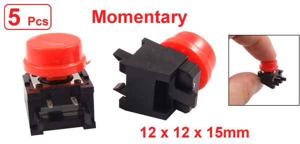 Product Name Tact Switch Action Type Momentary Switch Size 12 x 12 x 15mm / 0.47" x 0.47" x 0.59" (L*W*H) Button Size 8 x 11mm/ 0.31" x 0.43"(H*D) Pin Spacing 5mm/0.19" Pin Size 5 x 1mm/ 0.19" x 0.03"(L*W) Material Plastic, Metal, Electric Parts Main Color Red, Black Net Weight 9g Package Content 5 x Tact Switches - Reviews