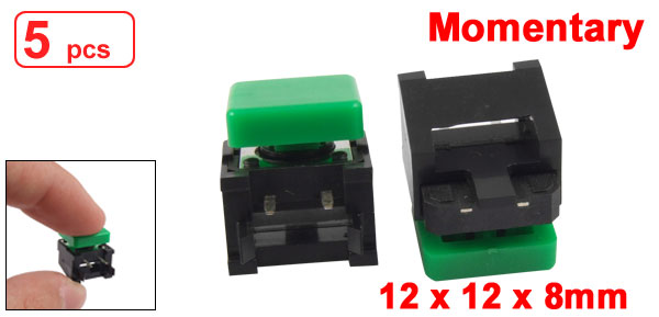 Details5x Momentary Tact Tactile Push Button Switch Right Angle 12 x 12mm x 8mm + Cap  Product Name Tact Switch Contact Type Momentary Dimension 12 x 12 x 8mm/ 0.47" x 0.47" x 0.31" (L*W*H) Overall Size 18 x 13 x 15mm/ 0.7'' x 0.51'' x 0.59'' (L*W*H) Button Dia. 12mm/ 0.47" Pin Pitch 5mm/ 0.2" Pin Length 5mm/ 0.2" Material Plastic, Metal, Electric Parts Color Green, Silver Tone Net Weight 9g Package Content 5 x Tact Switches