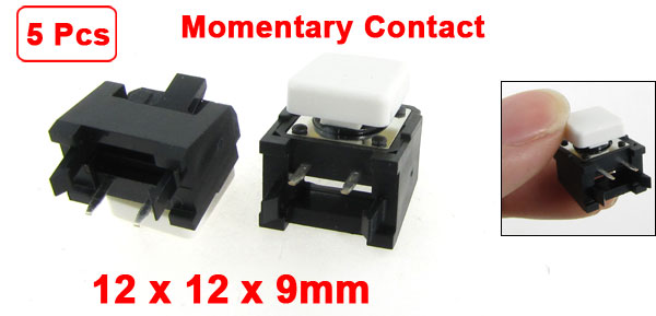 Product Name Tact Switch Contact Type Momentary Contact Dimension 12 x 12 x 9mm/ 0.47" x 0.47" x 0.35" (L*W*H) Button Size 10 x 10 x 3mm/ 0.39" x 0.39" x 0.12"(L*W*H) Pin Pitch 5mm/ 0.2'' Pin Length 5mm/ 0.2'' Material Plastic, Metal, Electric Parts Color Black, Silver Tone, White Net Weight 8g Package Content 5 Pcs x Tact Switches - Reviews