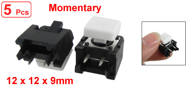 Product Name Tact Switch Contact Type Momentary Contact Dimension 12 x 12 x 9mm / 0.47" x 0.47" x 0.35" (L*W*H) Button Size 10 x 10 x 3mm/ 0.39" x 0.39" x 0.12"(L*W*H) Pin Pitch 5mm/ 0.2'' Pin Length 5mm/ 0.2'' Material Plastic, Metal, Electric Parts Color Black, Silver Tone, White Net Weight 8g Package Content 5 Pcs x Tact Switches - Reviews