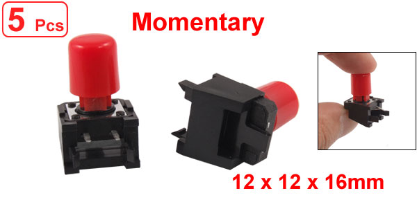 Product Name Tact Switch Action Type Momentary Switch Size(include Cap) 12 x 12 x 16mm / 0.47" x 0.47" x 0.63" (L*W*H) Overall Size(include Cap) 13 x 18.5 x 22mm / 0.51" x 0.73" x 0.86"(L*W*H) Button Size 13 x 8mm/ 0.51" x 0.31"(H*D) Pin Spacing 5mm/0.19" Pin Size 5 x 1mm/ 0.19" x 0.03"(L*W) Material Plastic, Metal, Electric Parts Main Color Red, Black Net Weight 10g Package Content 5 x Tact Switches - Reviews