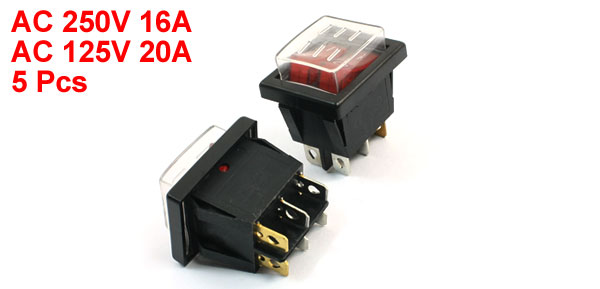 Product Name Rocker Switch Action Dual SPST Terminals 6 Pin (ON-OFF) Position Number 2 Light Color Red Rating Voltage 16A 250VAC 20A 125VAC Total Size 3.6 x 2.8 x 4cm/1.4" x 1.1" x 1.6"(L* W *T) Mounting Dimension 3 x 2.1cm/1.2" x 0.8"(L*W) Color Black, Clear, Silver Tone Material Plastic, Rubber, Metal Total Weight 83g Package Content 5 x Rocker Switch w Cover - Reviews