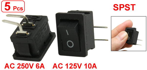Product Name Rocker Switch Poles SPST Terminals 2 Pin (On-Off) Rating Voltage AC 250V 6A AC 125V 10A Total Size(Each One) 2.1 x 1.5 x 2.5cm/ 0.82" x 0.6" x 1"(L*W*T) Mounting Size 1.8 x 1.3 x 2cm/ 0.7" x 0.5" x 0.78"(L*W*T) Color Black Material Plastic, Metal Total Weight 17g Package Content 5 x Rocker Switch - Reviews