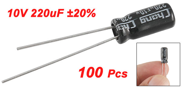 Product Name Aluminum Electrolytic Capacitor Type Radial Lead Maximum Temperature 105°C Withstand Voltage 10V Capacitance 220uF Capacitance Tolerance ±20% Body Size 5 x 11mm / 0.2'' x 0.43'' (D*L) Lead Spacing 2mm / 0.08'' Lead Length 24mm / 0.94'', 19mm / 0.75'' External Material Aluminum Weight 36g Color As Picture Shown Package Content 100 Pcs (±2%) x Electrolytic Capacitors - Reviews
