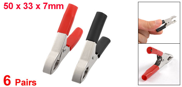 Product Name Alligator Clip Material Soft Plastic, Metal Color Black, Red, Silver Tone Overall Size(Each) 50 x 33 x 7mm / 2" x 1.3" x 0.3"(L*W*H) Jaw Open Width 16mm / 0.629"(Max.) Weight 57g Package Content 6 Pairs x Alligator Clips - Reviews