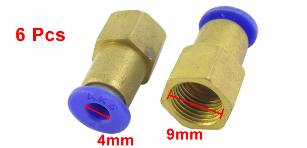 Product Name Quick Fitting Model PCF4-02 Female Thread Dia. 9mm/ 1/8PT Push in Pipe Dia(Blue End) 4mm/ 0.16" Total Size 22x 12mm/ 0.87" x 0.47" (L*Max.D) Main Material Metal, Plastic Color Brass Tone, Blue Weight 67g Package Content 6 x Quick Fittings - Reviews