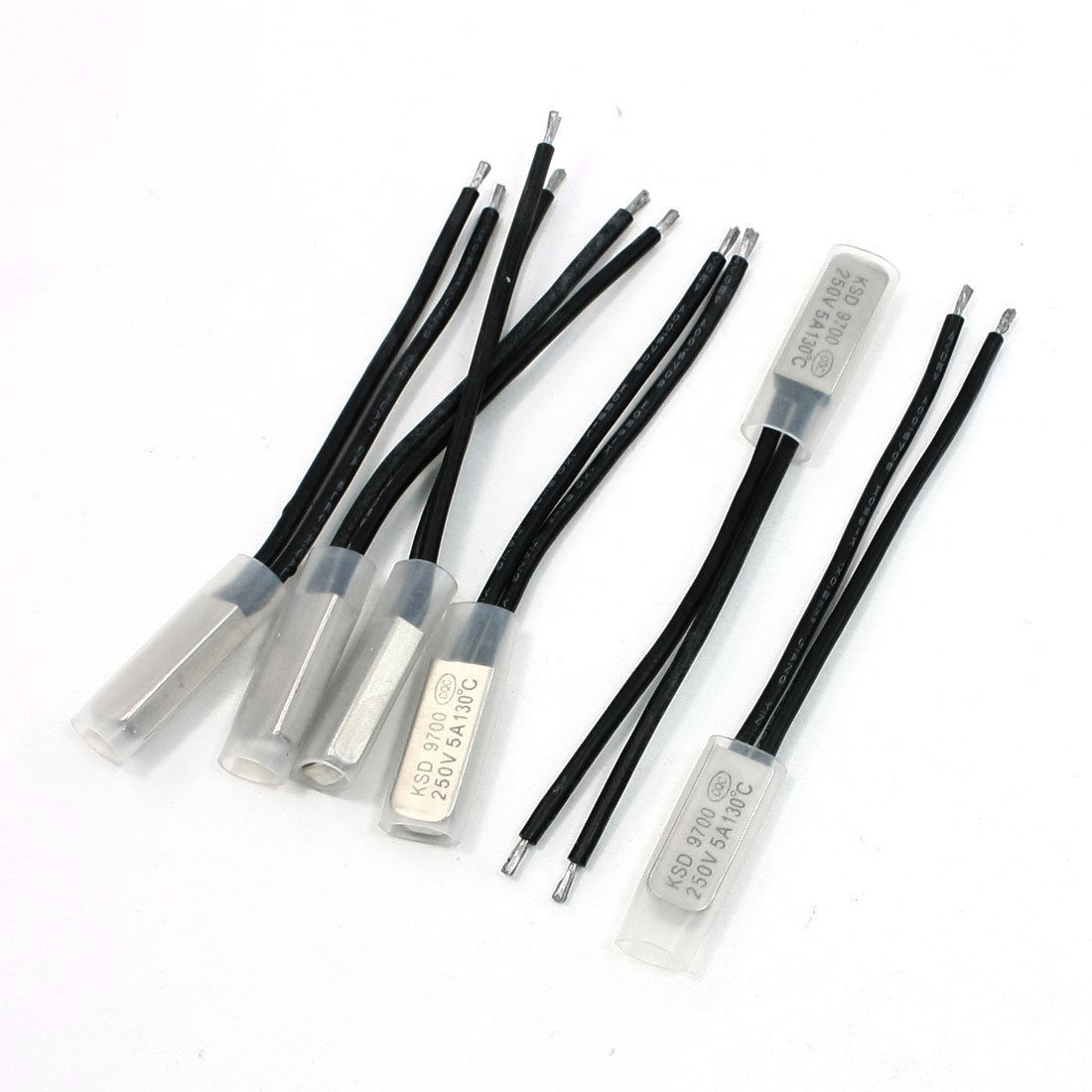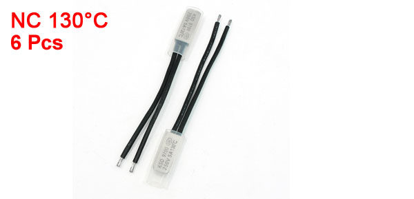 Rated Power 250V 5A Active Temperature 130°C Lead Wire Length 7.3cm / 2.9" Head Dimension 20 x 7.5 x 3.5mm/0.78" x 0.3" x 0.14"(L*W*T) Material Bimetal ,Plastic,Stainless Steel Main Color Silver Tone, Black Net Weight 21g Package Content 6 PCS x Temperature Control Switch - Reviews