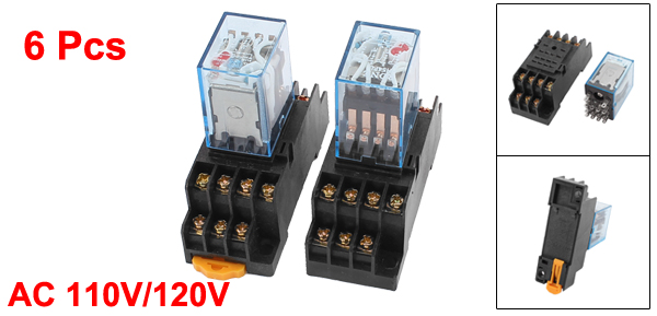 Details6 Pcs AC 110V/120V Coil 4PDT 35mm DIN Rail Electromagnetic Power Relay + Socket  Product Name Power Relay Coil Voltage AC 110V/120V Light Color Red Type 4PDT Number of Terminals 14 Mount Rail Type 35mm DIN Rail Fixing Mount Hole Size 6 x 4.5mm/0.24" x 0.18"(L*W) Size (Approx.) 7 x 2.9 x 6.5cm/2.8" x 1.1" x 2.6"(L*W*H) Shell Material Plastic, Electric Parts Main Color Black, Clear Net Weight 428g Package Content 6 x Power Relay