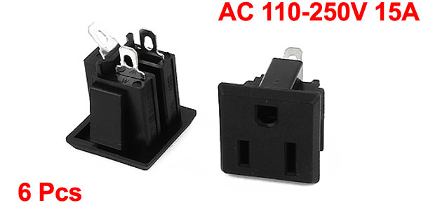 6 Pcs AC 110V-250V 15A Panel Mount Power Socket Connector Black for US 2Pin Plug