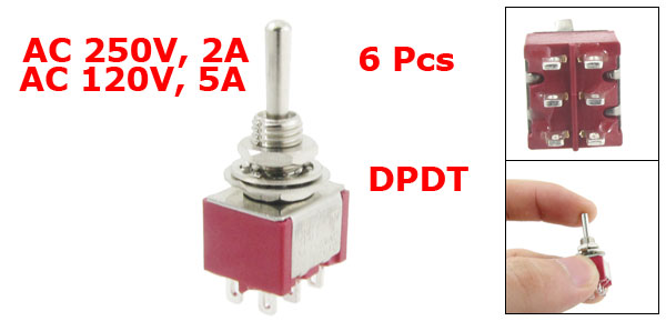 Action Type Momentary Pin Number 6 Pins Position 3 Positions(ON/OFF/ON) Type DPDT Cap Diameter 5.8mm / 0.228" Body Size(Approx.) 13 x 11.6 x 10mm / 0.5" x 0.46" x 0.4"(L*W*T) Total Height 33mm / 1.3" Material Plastic, Metal Weight 36g Package Content 6 Pcs x Toggle Switch - Reviews