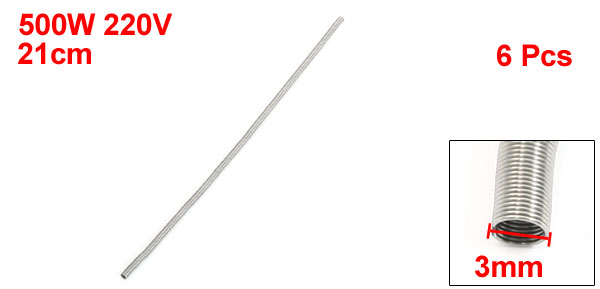 Product Name Heating Element Coil Voltage 220V Power 500 W Size 210 x 3mm/8.3" x 0.12"(L*D) Wire Diameter 0.2mm/0.008" Material Kanthal A1 Color Silver Tone Gray Weight 28g Package Content 6 x Heating Element Coil - Reviews