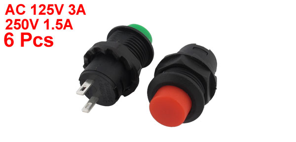 Details6 Pcs ON-OFF Momentary Round Red Green Push Button Switch AC 125V/3A 250V/1.5A  Main Color Black, Green, Red Brand DMiotech Country of Manufacture CHINA Action Type Momentary Button Diameter 9mm / 0.35" Total Height 3cm / 1.2 Material Plastic, Metal Contact Type NO, SPST Pins 2 Product Name Push Button Switch Net Weight 17g Package Content 6 x Push Button Switch Rating AC 125V/3A 250V/1.5A Mounting Thread Dia 12mm